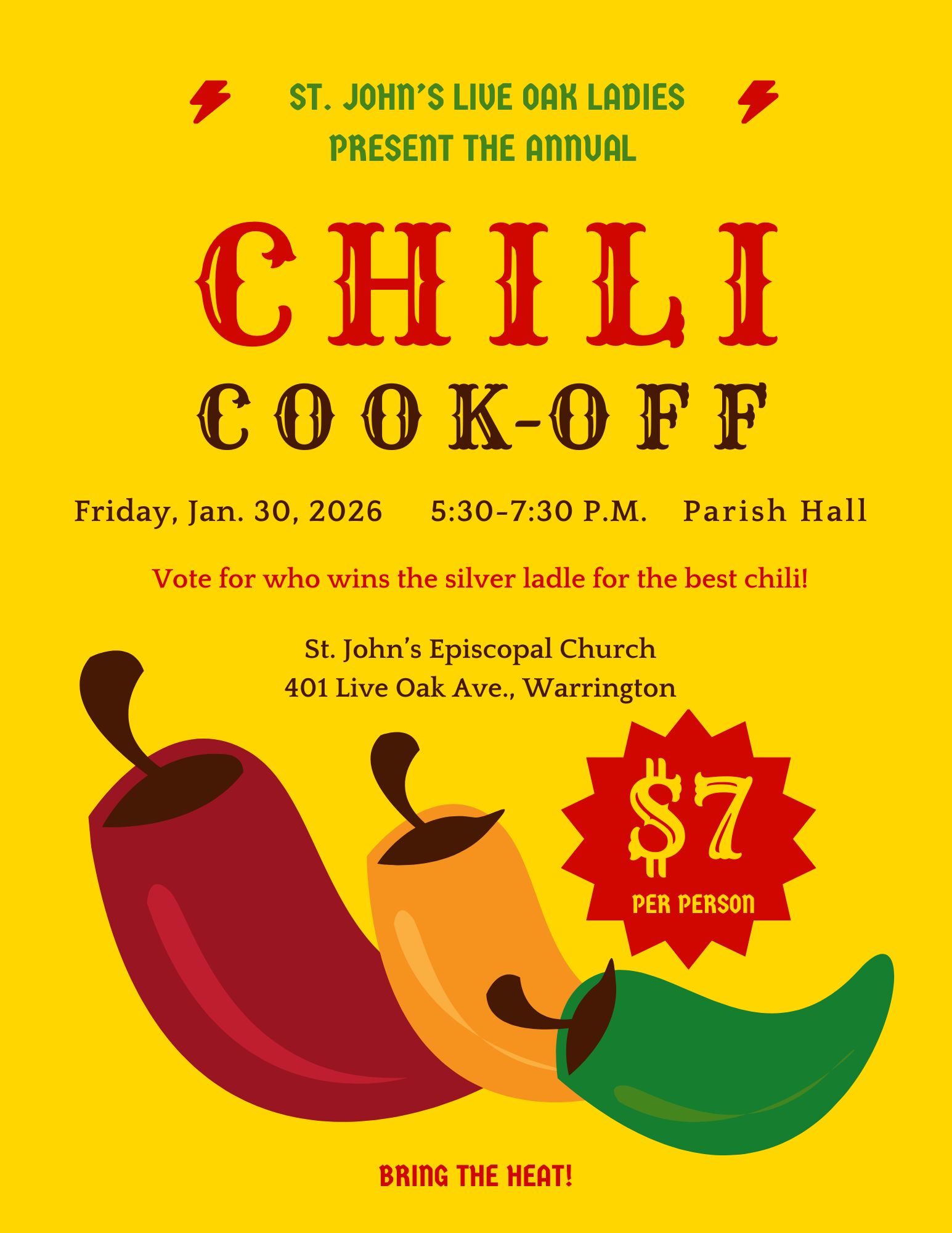 The Live Oak Ladies of St. John's Episcopal Church invite you to their annual Chili Cookoff! Come and vote for your favorite pot of chili and who will win the silver ladle! Cost is $7 per person. See you in the Parish Hall at 5:30 p.m. Friday, Jan. 30!
